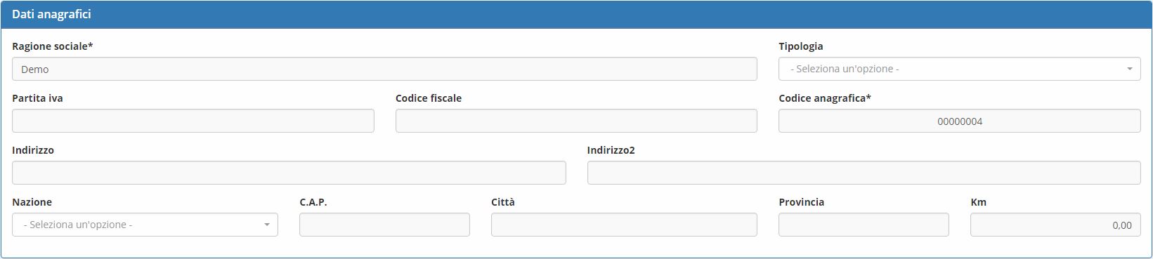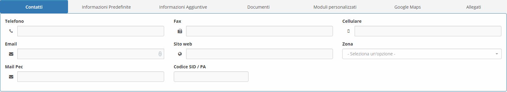 Le schede anagrafiche dei clienti contengono tutte le informazioni anagrafiche relative ai clienti. Sotto la Voce di menu Anagrafiche si trova la possibilita' di aggiungere le Zone e i Sedi. Tramite la funzione Aggiungi Zona c'è la possibilta' di scrivere il Nome Zona e Descrizione. Invece tramite la funzione Sedi è possibile Aggiungere Il Nome Sede sgeliendo il Cliente di Riferimento. La funzione Anagrafiche consente la creazione dei dati anagrafici tramite l'opzione +.